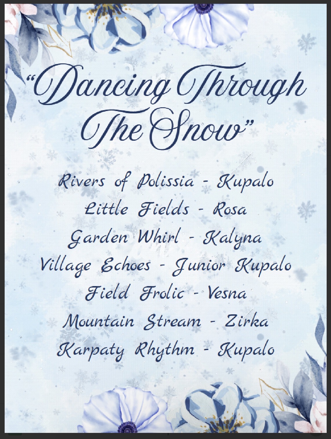 2. Winter Concert January 18, Kupalo arrive at 1:30PM, everyone else arrive at 2:00PM dressed and ready to rehearse. The doors will open at 2:45PM and the show will begin promptly at 3:00PM.