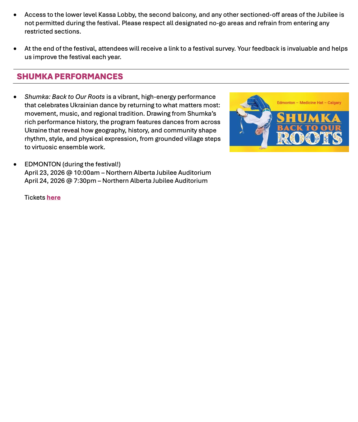 3. In lieu of tickets, there will be an option to make a small donation online (to our store). This specifically recoups food and beverage costs, and keeps the concert free for our dancers (we don't enjoy raising tuition.) Thanks for your understanding and support of our not-for-profit volunteer run organization :)